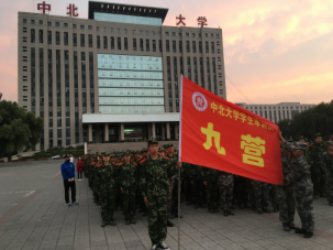 微微阴暗的天色遮不住新生们的高涨热情与蓬勃朝气,队伍前方代表经管院的“九营”旗帜高高扬起,队伍中同学们昂首挺胸,高喊口号,气势磅礴。