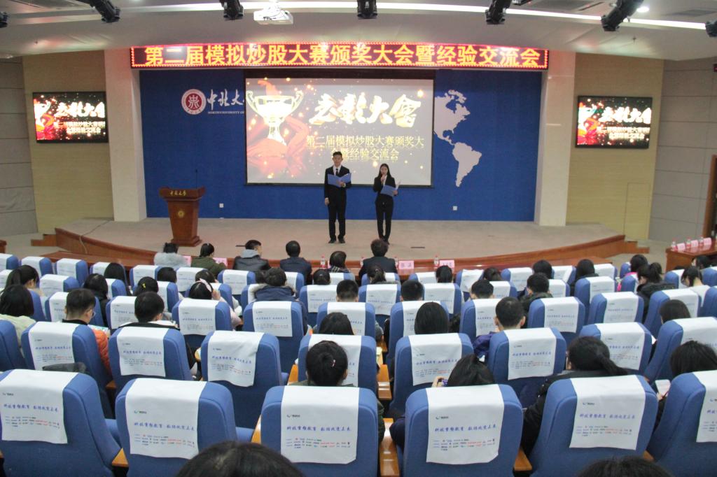 12月26日下午3点,由经济与管理学院国君财富学社主办、学生会宣传部协办的第二届模拟炒股大赛颁奖大会暨经验交流会在瑾瑜国际会议中心成功举办。中北大学校团委副书记魏翀,经济与管理学院党委副书记屈有明,国君财富学社指导老师周娟美和国泰君安证券有限公司太原并州北路营业部经理刘泽出席大会现场。